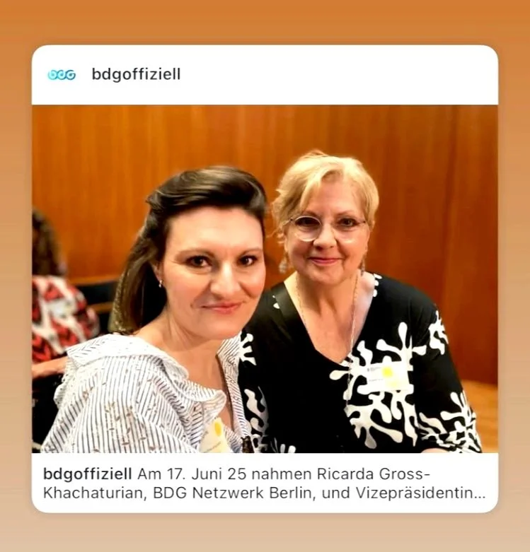 “Am 17. Juni 25 nahmen Ricarda Gross-Khachaturian, BDG Netzwerk Berlin, und Vizepräsidentin Angela Nick in der Landesvertretung Baden-Württemberg in Berlin teil an einem „Treffen der Kulturschaffenden".”